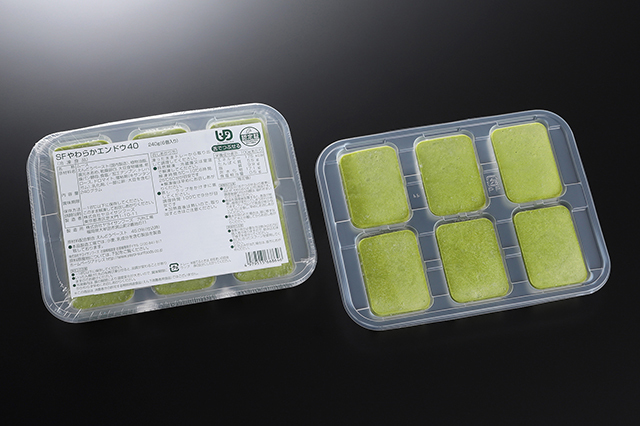 カットの工夫で様々なメニューに活用できるブロックタイプの野菜ムースです。 エンドウ豆の風味と彩りを再現しています。1パック6個入です。