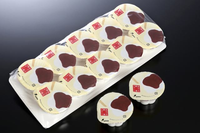 和菓子のあんころ餅をイメージしたカップデザートです。下層のゼリーにはもち粉を加え、お餅の風味を出しました。